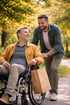 Eine Frau schiebt eine andere Frau im Rollstuhl durch einen sonnigen Park.